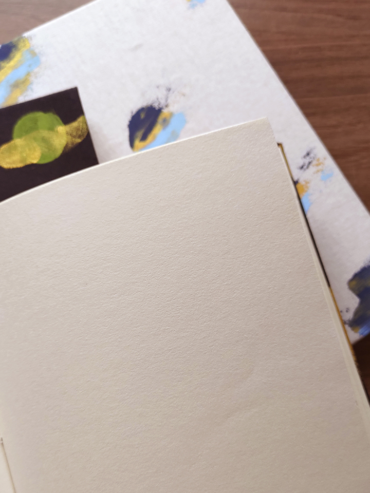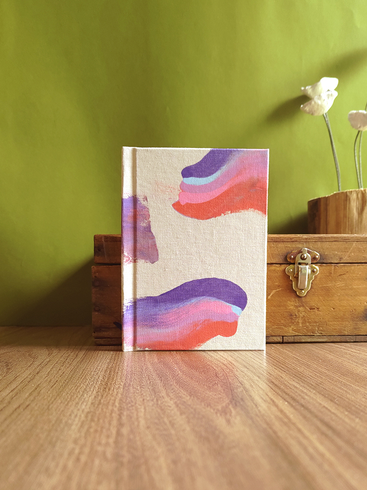 As pinceladas não seguem padrão fixo, o papel aceita a cor onde quer, e a capa se constrói como um território de experimentação.